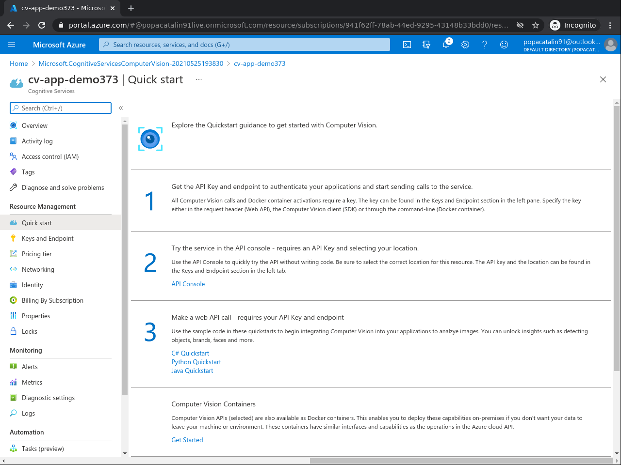 • Create a Computer Vision Cognitive Services resource using the Azure Portal