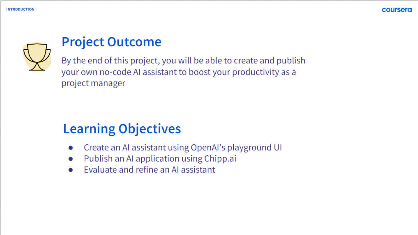 In this 2-hour long project-based course, you will be able to Create an AI assistant using OpenAI's playground UI, publish an AI application using Chipp.ai, and evaluate and refine your AI assistant.