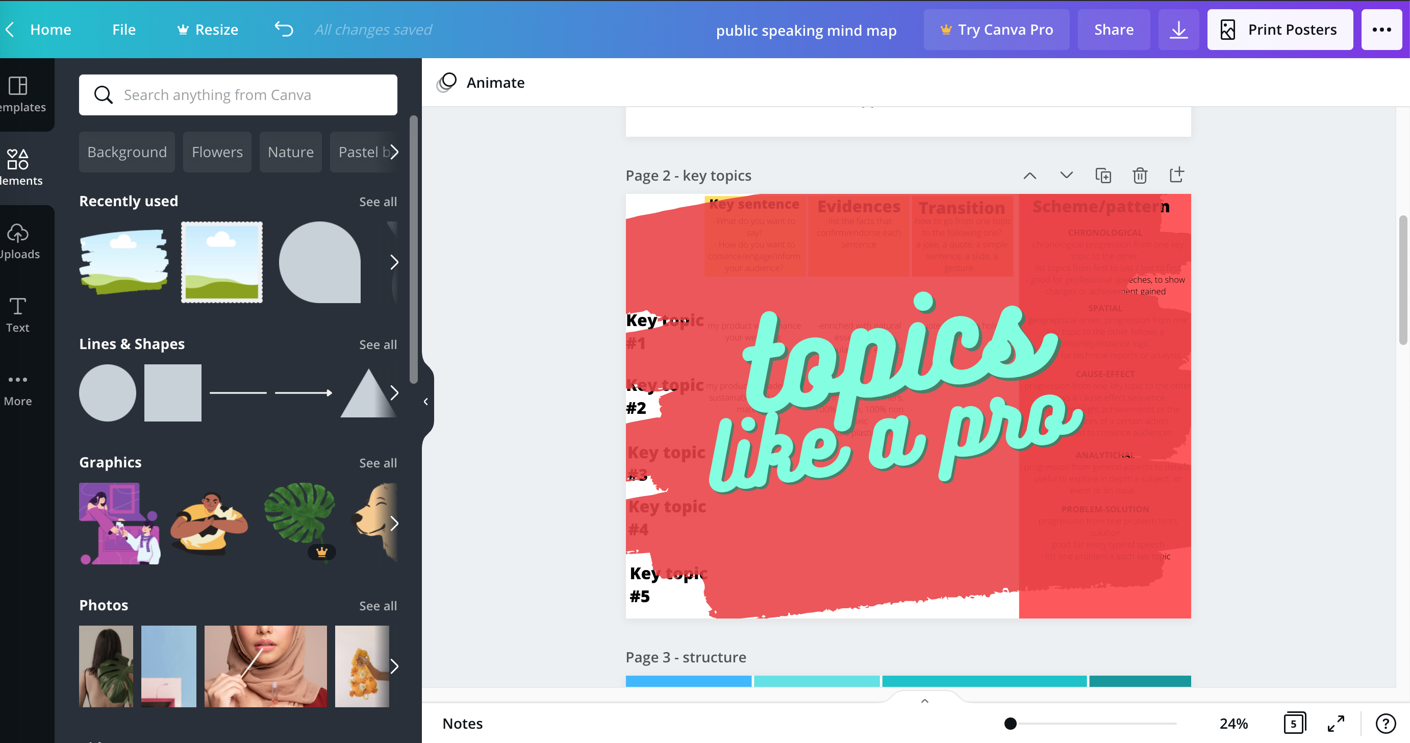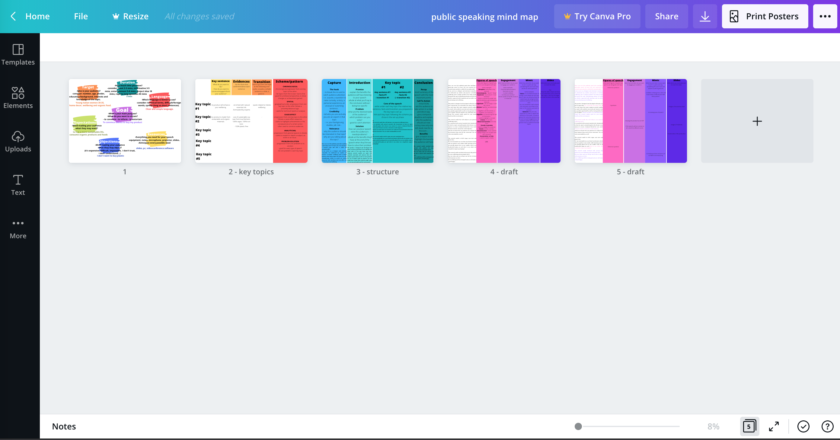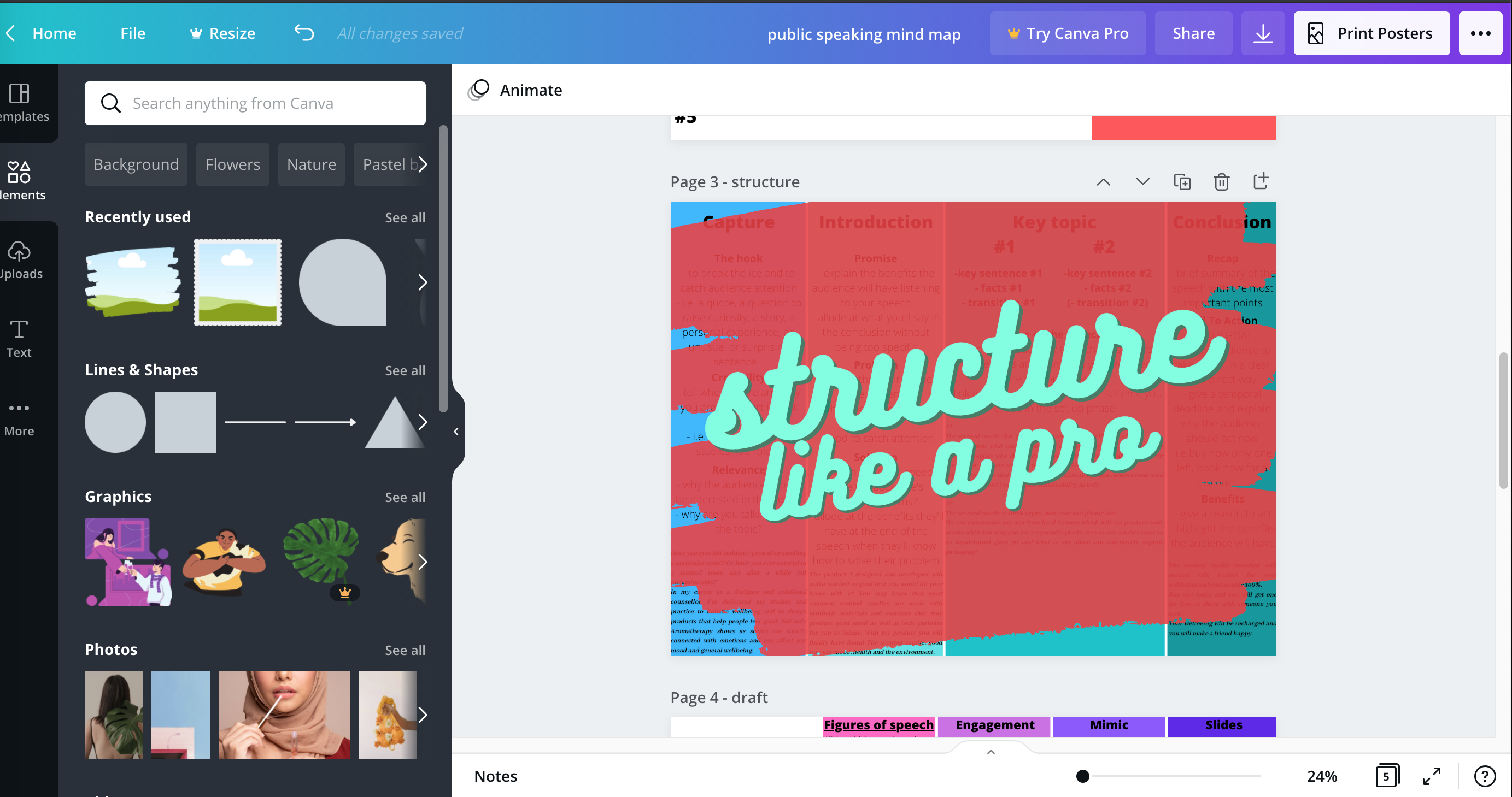 You’ll be able to explore models and structure to feel confident in your public speaking competence and implement those skills in your life during dissertations, while pitching to your clients or while performing a TED talk, why not. Public speaking has traditionally meant the act of speaking face to face to a live audience but today includes any form of speaking to an audience, including pre-recorded speech delivered over great distance by means of technology. Nowadays public speaking has been transformed by newly available technology such as videoconferencing, multimedia presentations, and other nontraditional forms, but the essentials remain the same. Being used for many different purposes, usually it crosses teaching, persuasion or entertaining, there are different approaches and techniques related on how to master public speaking. Canva is a graphic design platform, used to create visual contents such as social media graphics, presentations, posters, documents...The users can create their own graphic or choose from many templates ready to use. The platform is free to use with optional paid subscriptions for additional functionality. This guided project is for students, graphic designers, or the general public who are familiar with Canva and want to explore its tools to create a speech structure while improving their knowledge on public speaking.