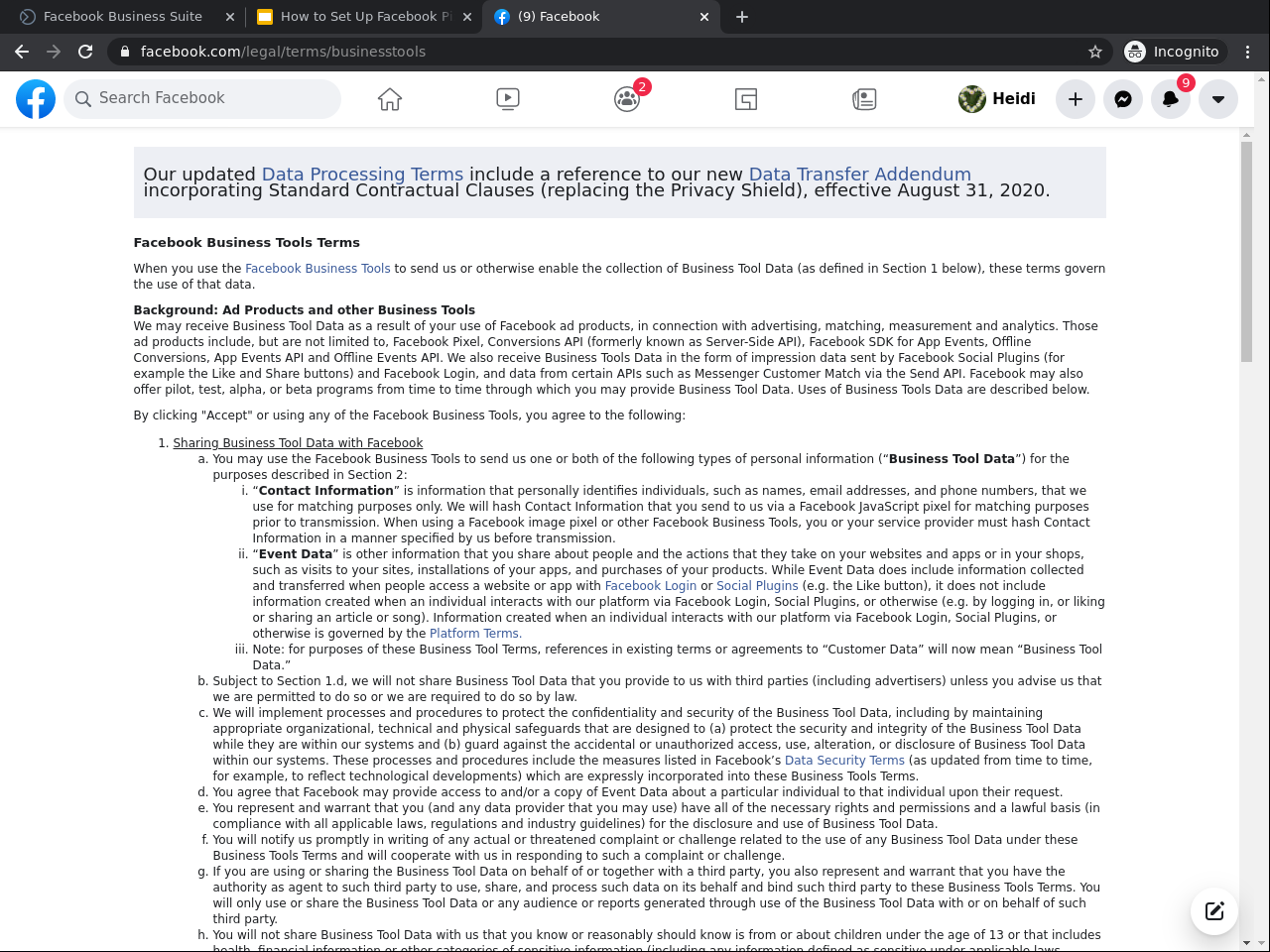 Analyze Facebook’s Business Tools Terms in relation to Facebook Pixel.